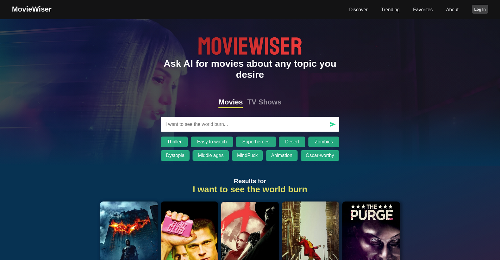 - 사용자 선호도에 기반한 영화 및 TV 프로그램 추천 - AI를 활용한 추천 엔진을 통한 개인화된 추천 - 다양한 섹션(Discover, Trending, Favorites, About)을 통한 내용 탐색 - 사용자 로그인을 통한 개인 프로필 액세스 - 사용자 입력에 따라 주제 또는 장르에 대한 영화 및 TV 프로그램 추천 - 다양한 장르(Thriller, Documentary, High School, Cult, War, Suspense, Japanese, Action, Great Soundtrack, Superheroes) 중 선택 가능 - 추천에는 해당 영화 및 TV 프로그램의 평점을 함께 제공 - 사용자의 선호도와 관심에 기반하여 새로운 영화 및 TV 프로그램 추천 가능